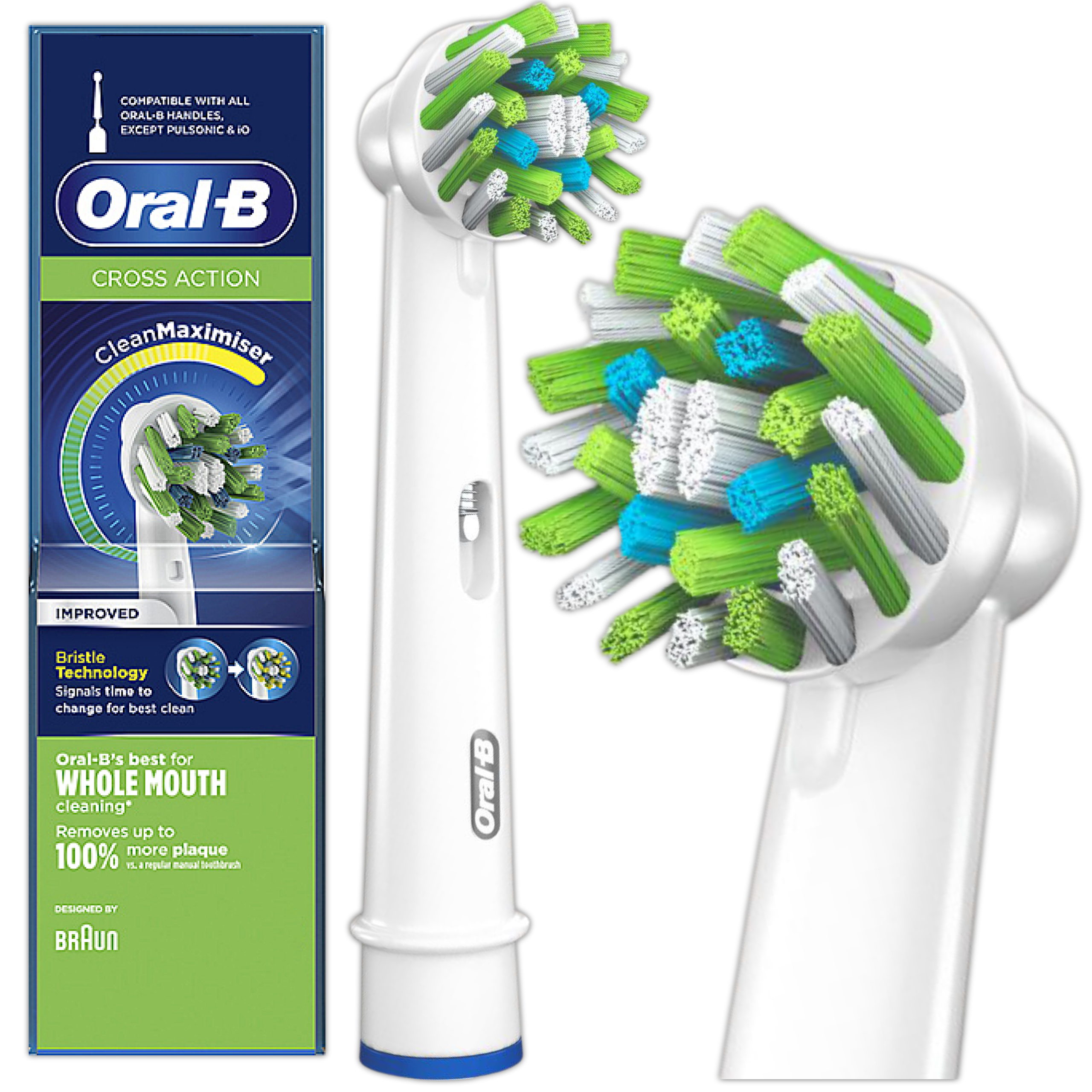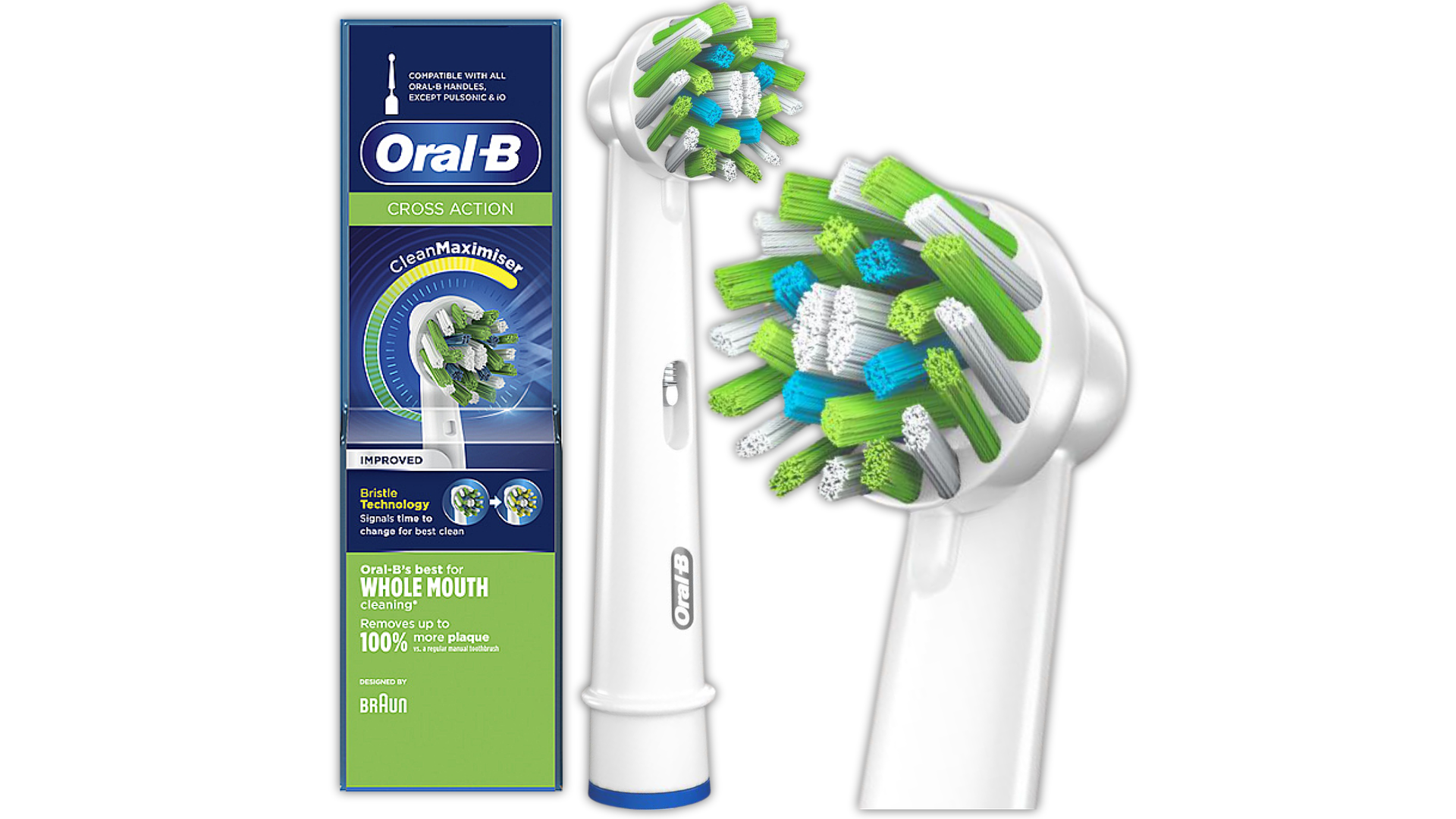 Główka szczoteczki Oral-B Cross Action ma specjalny kształt, który składa się z różnej długości włókien ustawionych pod różnymi kątami. Dzięki temu kształtowi, końcówka może docierać do trudno dostępnych miejsc w jamie ustnej i skuteczniej usuwać osad z zębów i przestrzeni międzyzębowych.