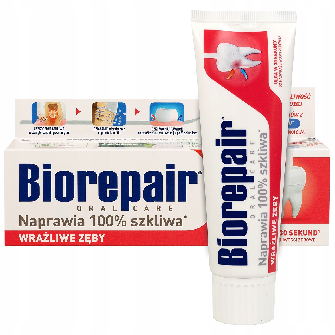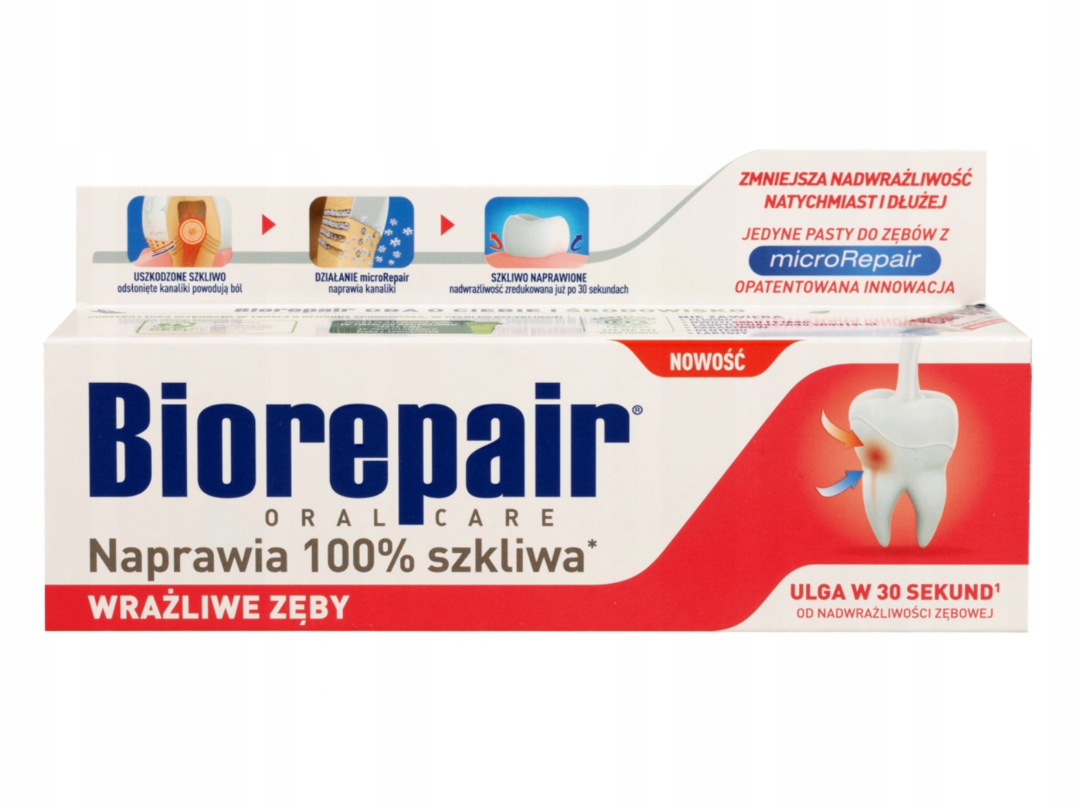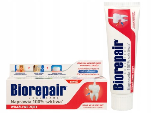 Innowacyjna pasta do codziennego szczotkowania zębów, już po pierwszym użyciu redukująca nadwrażliwość. Formuła pasty oparta jest na aktywnych mikrocząsteczkach biomimetycznego hydroksyapatytu MicroRepair, które strukturalnie przypominają cząsteczki obecne na powierzchni zębów. Mikrocząsteczki te mają zdolność przenikania w mikrouszkodzenia zębów, naprawiając zniszczone szkliwo i zamykając odsłonięte kanaliki zębiny. Już od pierwszego zastosowania pasta działa skutecznie, zmniejszając nadwrażliwość zębów. Możesz cieszyć się jedzeniem i picie bez nieprzyjemnych doznań związanych z nadwrażliwością.