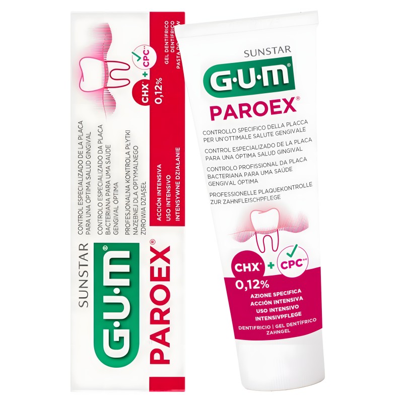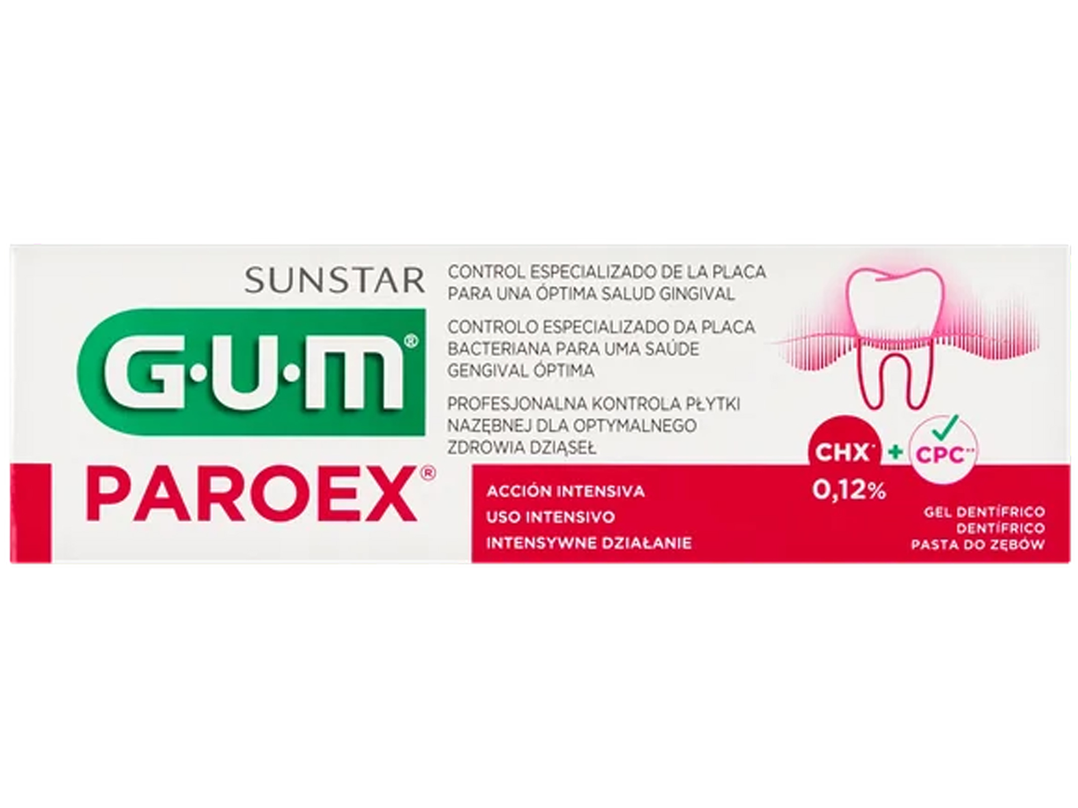 - Dzięki zastosowaniu chlorku cetylpirydyny (CPC) pasta GUM Paroex spowalnia odkładanie się płytki nazębnej. Składnik ten wzmacnia również działanie CHX.