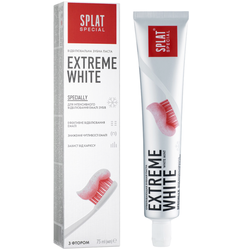 Pasta Splat Special Extreme White to część innowacyjnej i unikalnej linii produktów do higieny jamy ustnej, które zostały opracowane w laboratorium naukowym Splat. Dedykowana jest aktywnym i nowoczesnym osobom, które cenią eksperymentowanie, zdrowy styl życia i jasność. Seria ta oferuje emocjonalne produkty, każdy z nich tworzony z uwzględnieniem sugestii i potrzeb naszych klientów. Pasty do zębów z tej linii charakteryzują się bogatym składem, zawierającym ekskluzywne składniki.