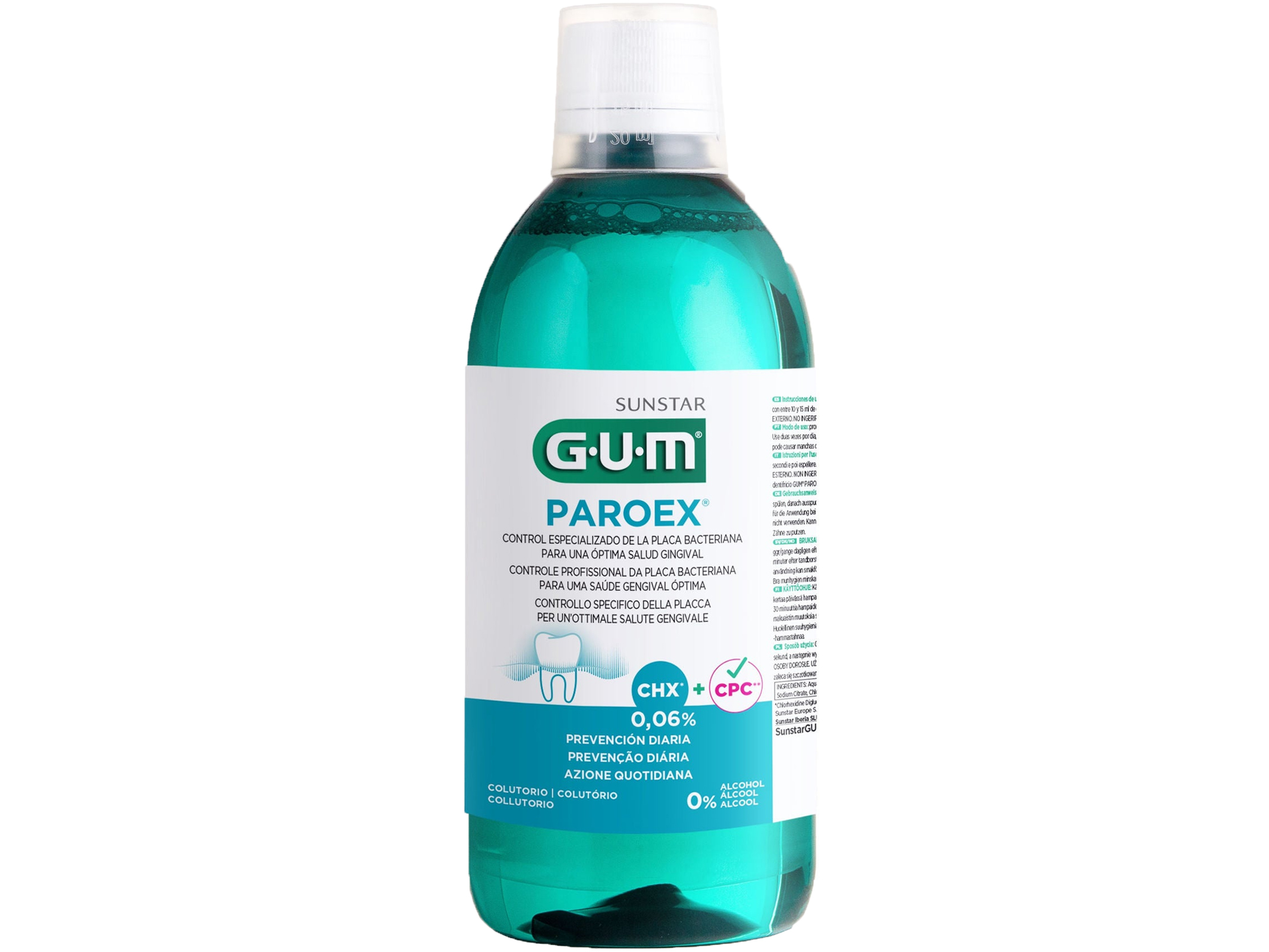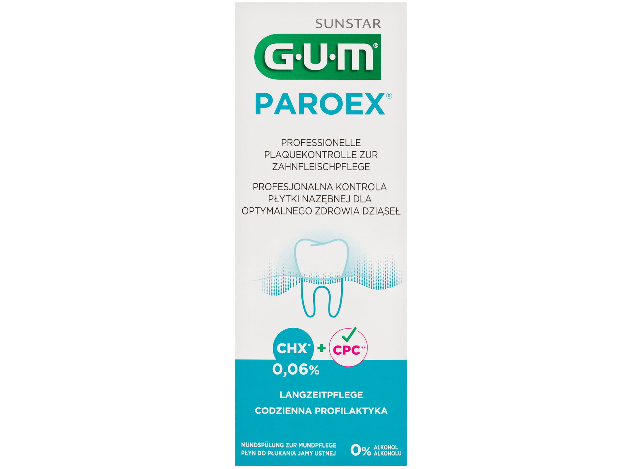 - Dzięki zastosowaniu chlorku cetylpirydyny (CPC) płyn GUM Paroex spowalnia odkładanie się płytki nazębnej. Składnik ten wzmacnia również działanie CHX.