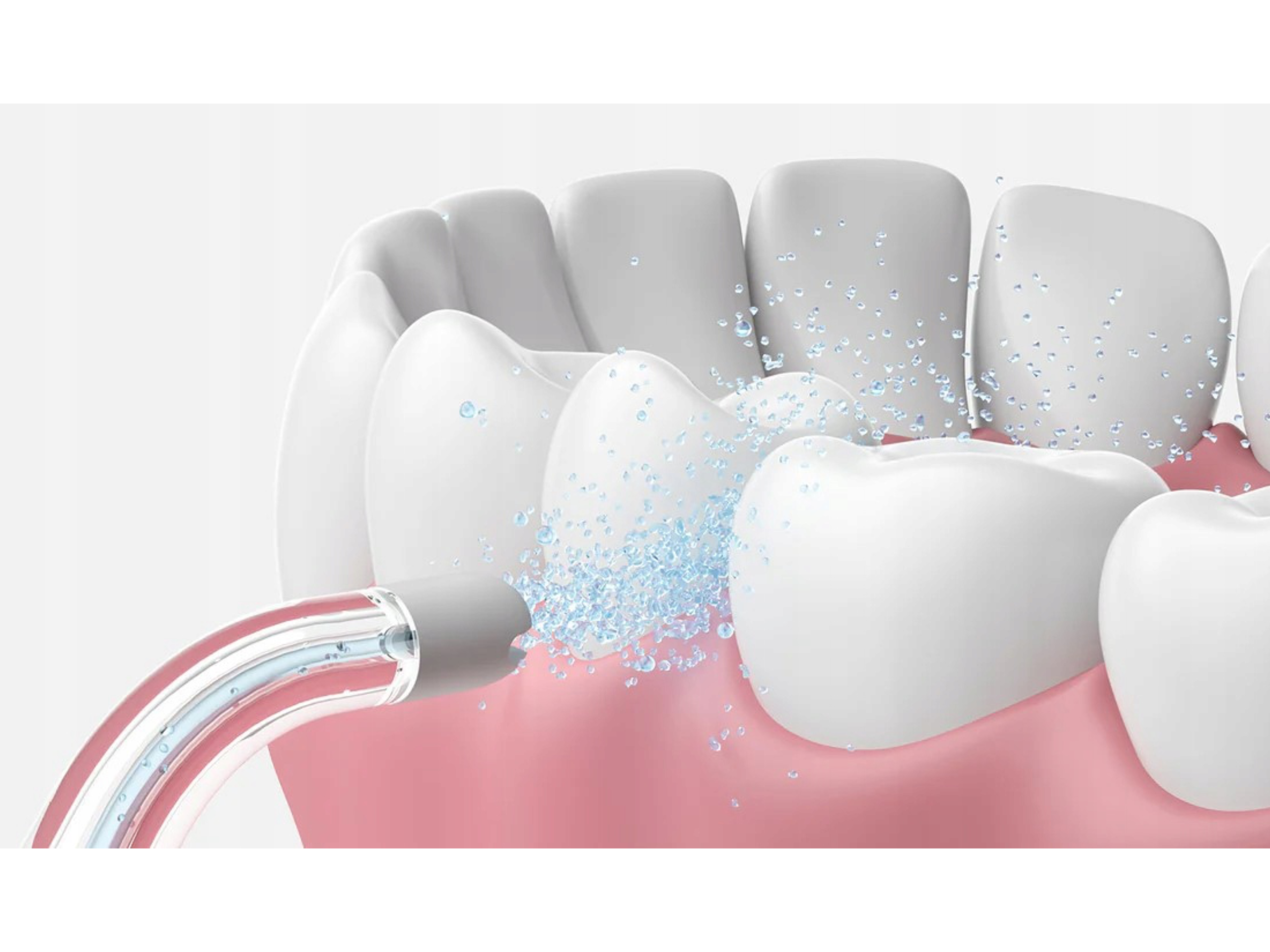 • Innowacyjna technologia AirPump – generuje napowietrzony strumień (98% powietrza i 2% wody), który skutecznie usuwa resztki jedzenia i płytkę nazębną, zapewniając kompleksową higienę jamy ustnej.