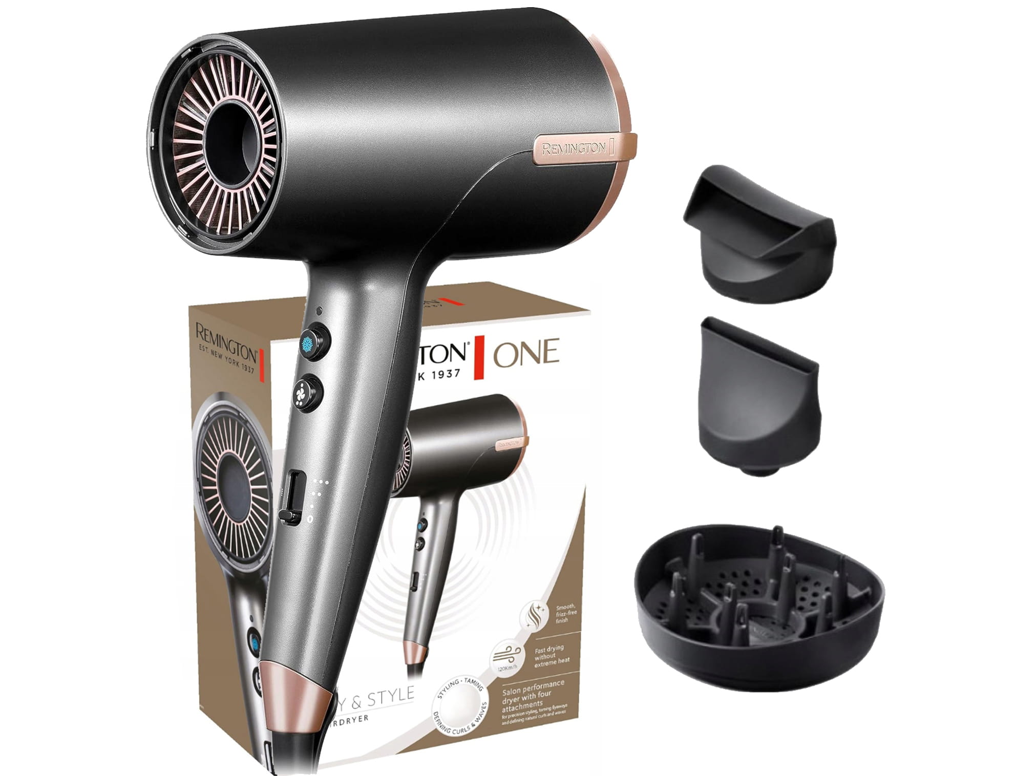 Włosy kręcone wymagają szczególnej troski. Suszarka Remington One została wyposażona w dyfuzor z krótkimi kolcami, który ujarzmia niesforne fale i pomaga nadać fryzurze pożądany kształt, bez niszczenia loków.