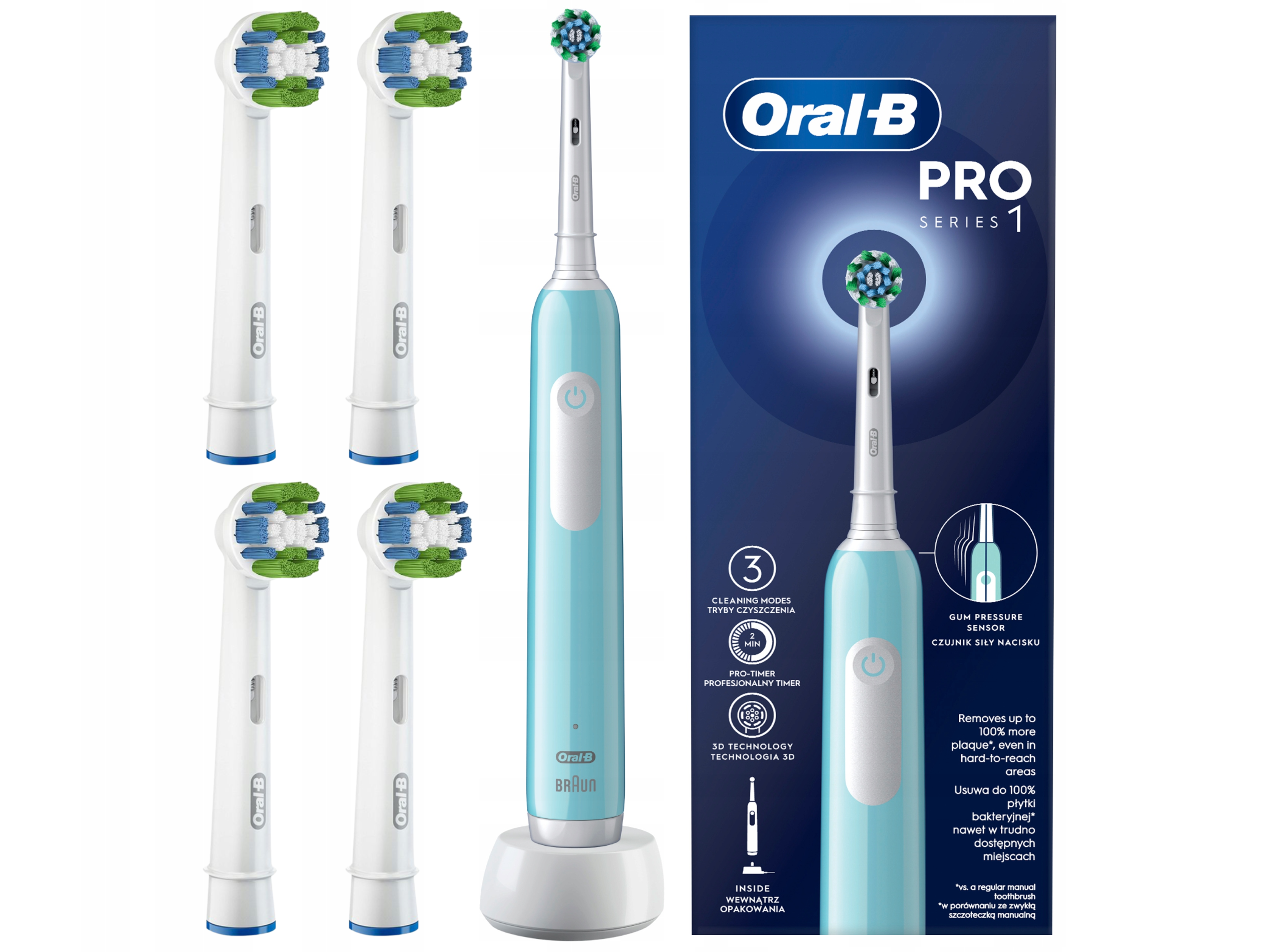 - W skład zestawu wchodzą: szczoteczka elektryczna, ładowarka oraz 5 końcówek Oral-B.