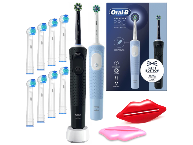 - W skład zestawu wchodzą: 2x szczoteczka elektryczna, ładowarka, 2 końcówki Oral-B, 8 końcówek zamienników, wyciskacze do pasty, oryginalne opakowanie, instrukcja obsługi.