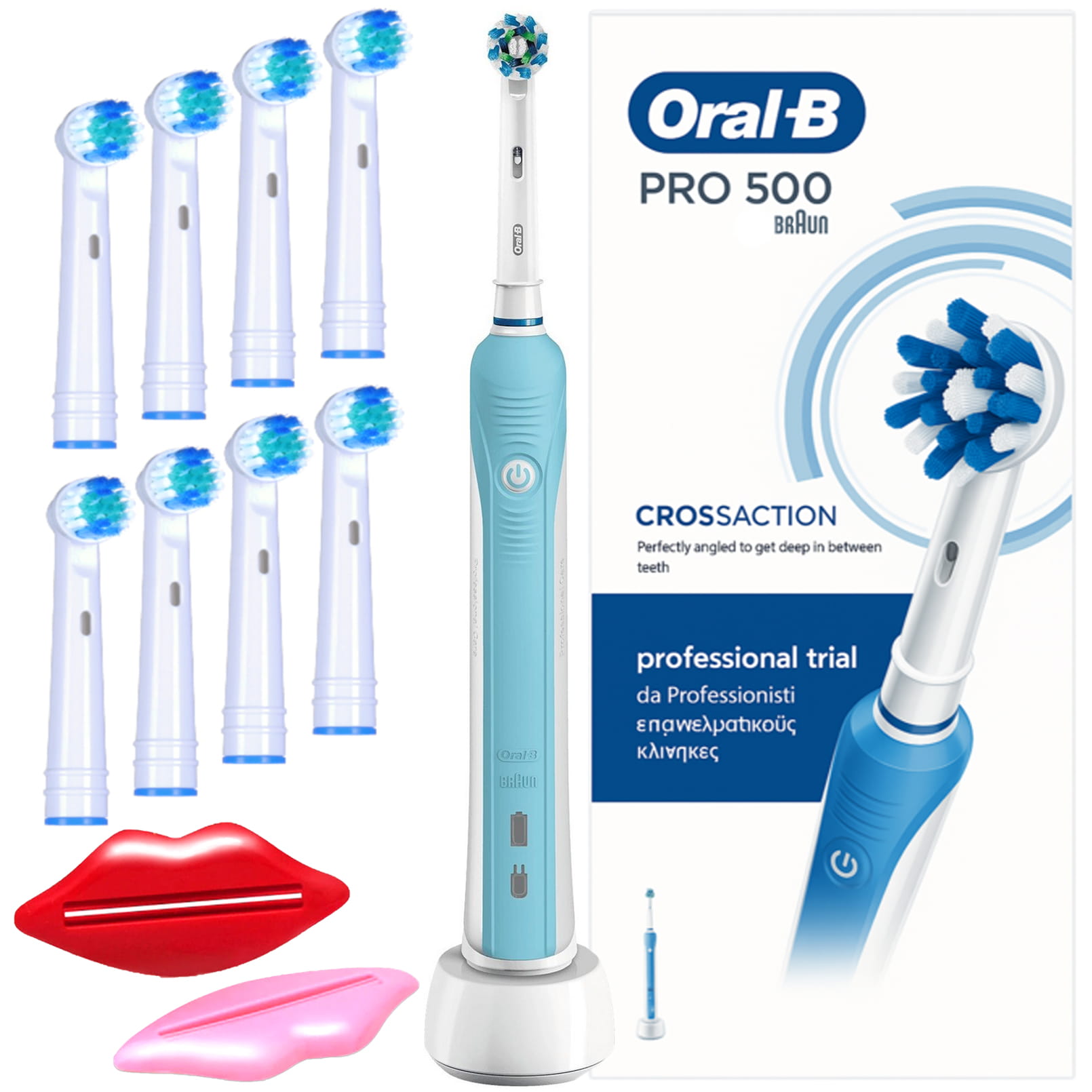 - W skład zestawu wchodzą: szczoteczka elektryczna, ładowarka, 1 oryginalna końcówka Oral-B, 8 końcówek zamienników, wyciskacze do pasty, instrukcja obsługi oraz opakowanie.