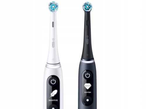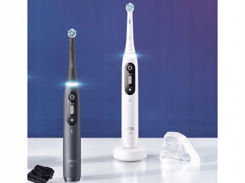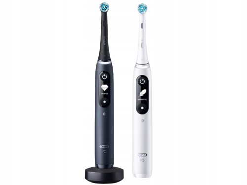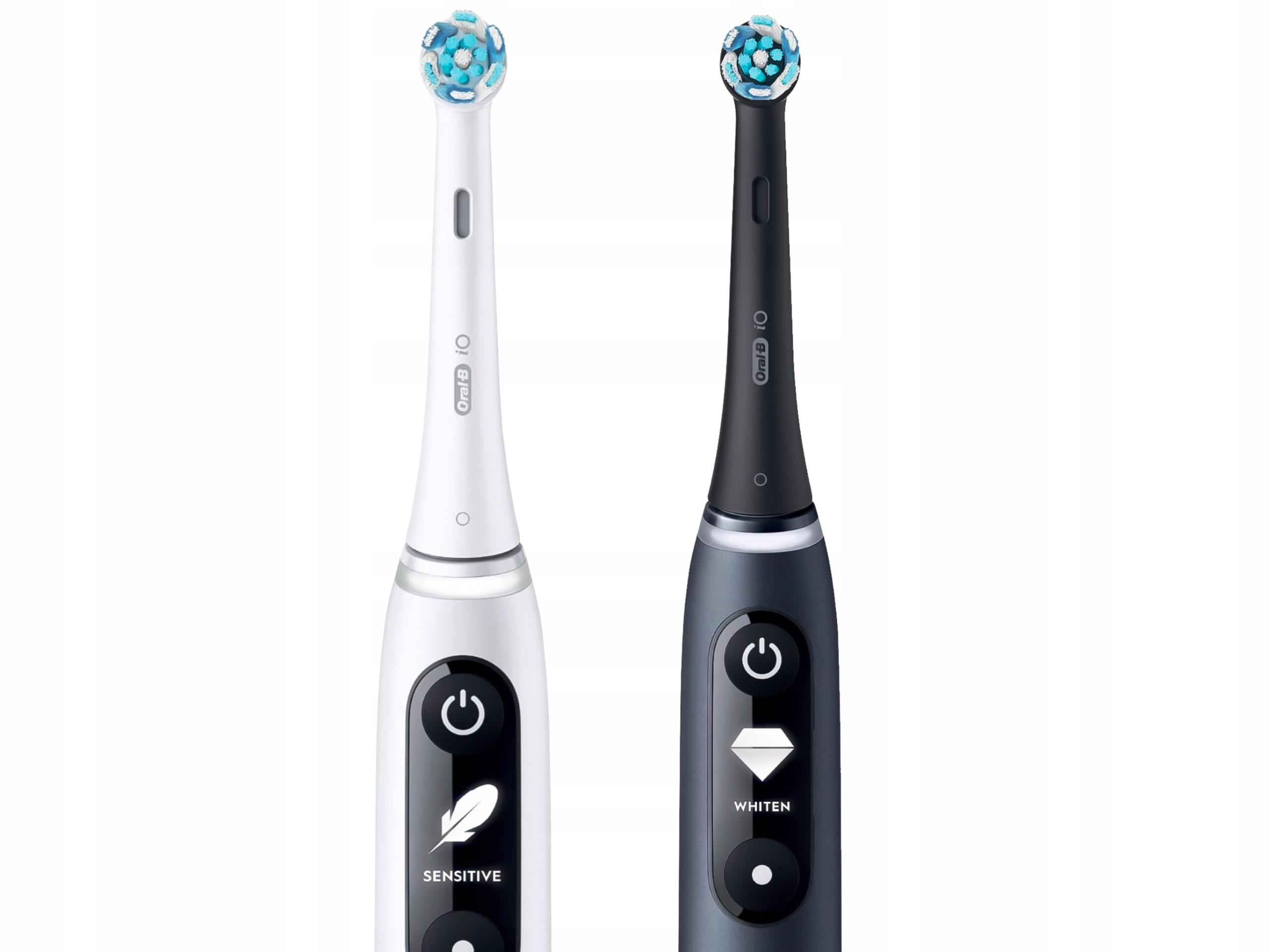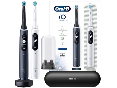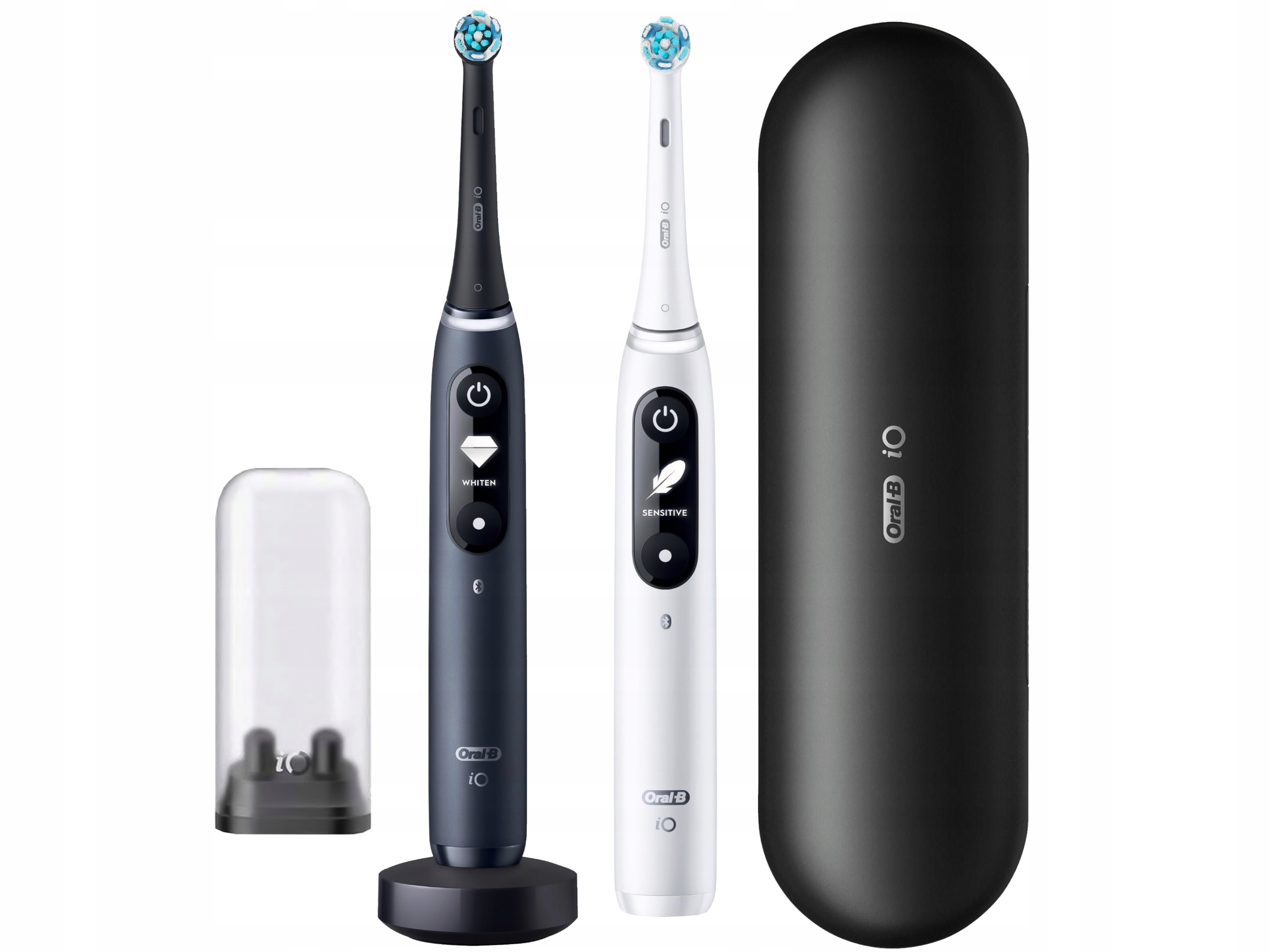 - W skład zestawu wchodzą: 2 szczoteczki elektryczne, 2 oryginalne końcówki Oral-B iO, ładowarka, etui na końcówki oraz etui na szczoteczkę.