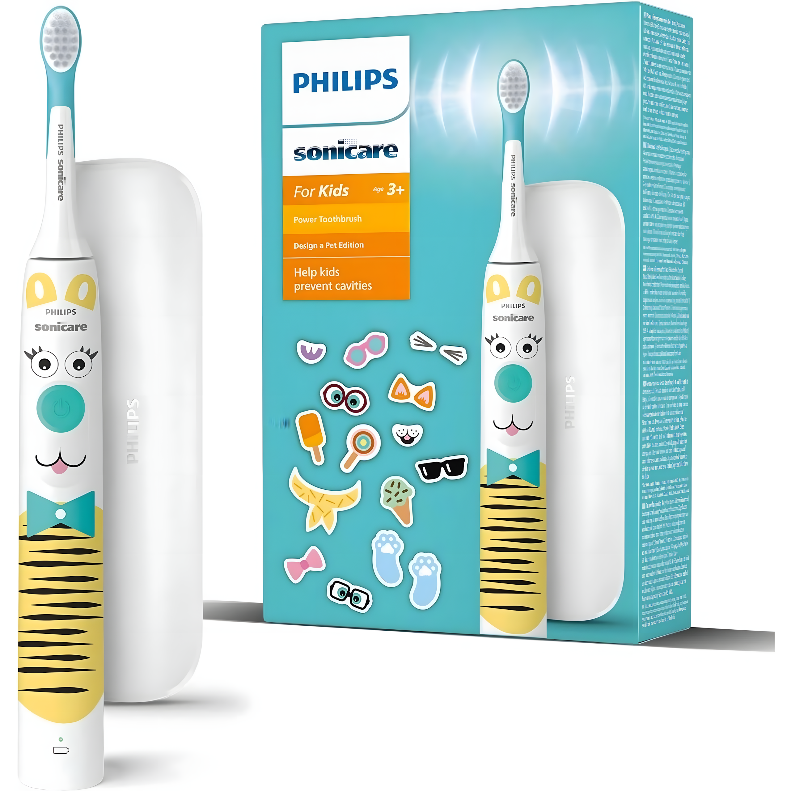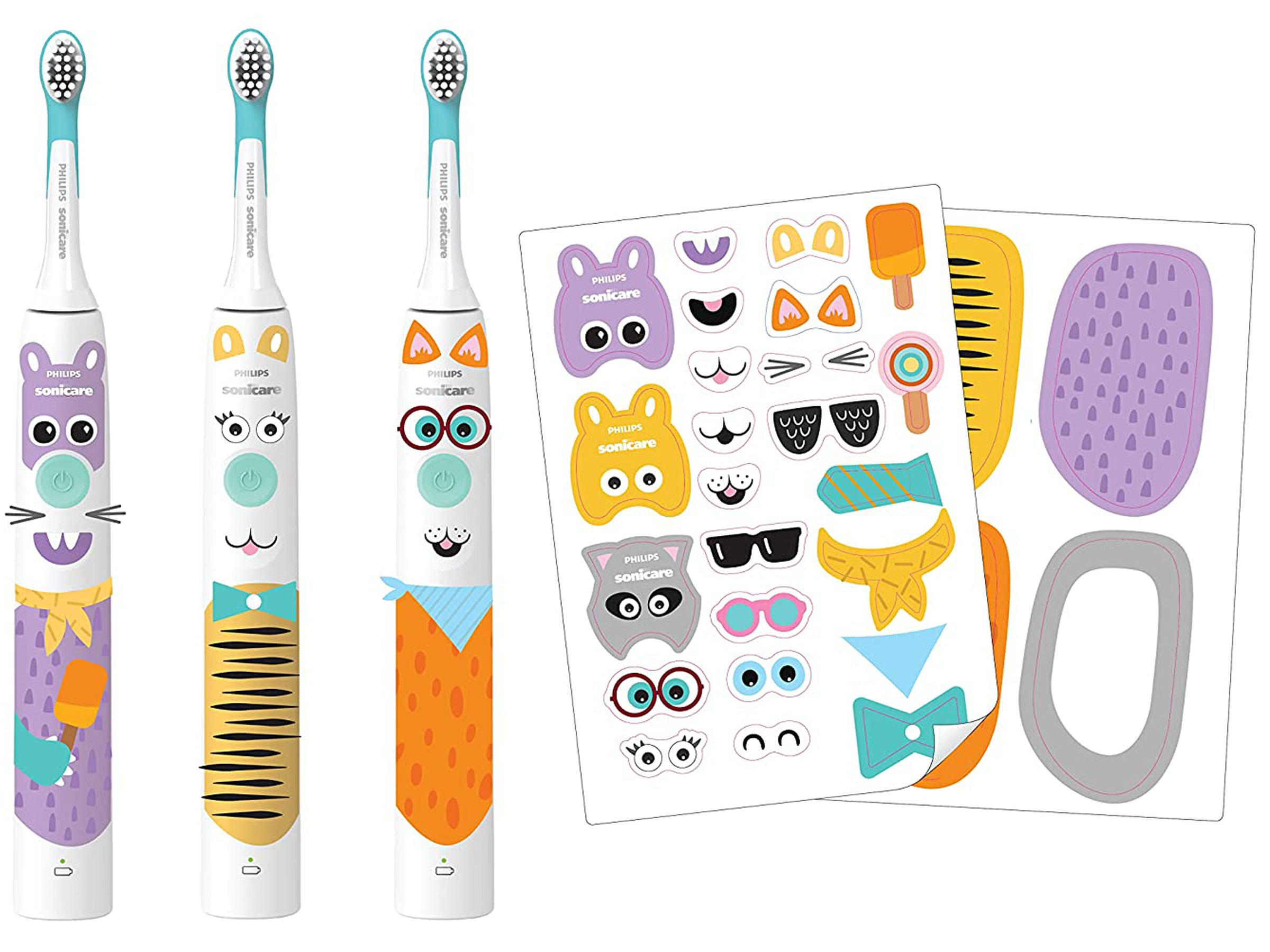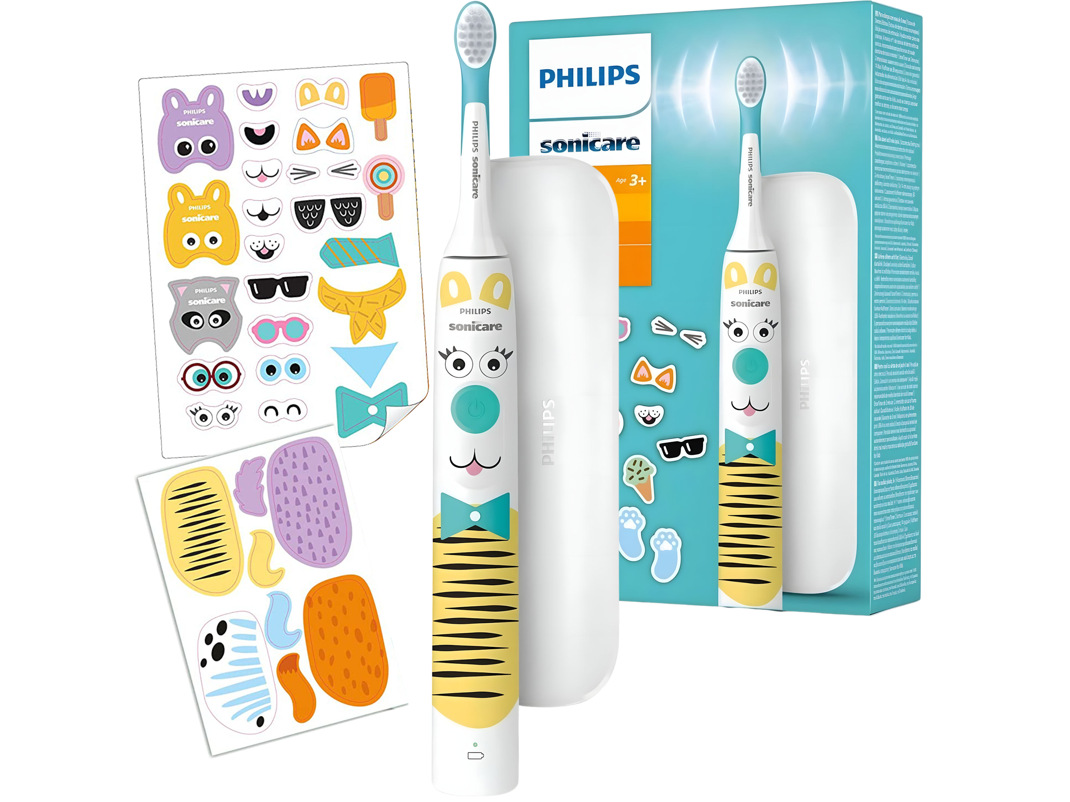 - W skład zestawu wchodzą: szczoteczka, ładowarka, oryginalna końcówka Sonicare for Kids, 2 arkusze naklejek na szczoteczkę, etui podróżne.