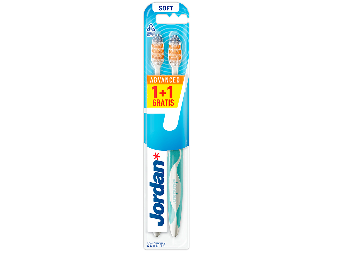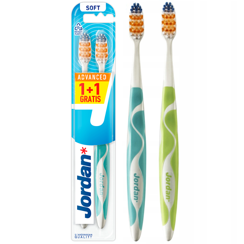 Szczoteczka Jordan Advanced Soft to poręczna szczoteczka, idealna do codziennego użytku i podróży. Posiada ergonomiczną i gumową rączkę, która zapewnia pewny i wygodny chwyt podczas szczotkowania. Dodatkowo, po trzech miesiącach regularnego szczotkowania, granatowe włosie traci kolor, co przypomina o konieczności wymiany szczotki.