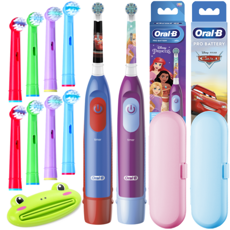 • skład zestawu wchodzą: 2 szczoteczki elektryczne, cztery baterie AA, 2 końcówki Oral-B, 8 końcówek zamienników, wyciskacz do pasty, 2x etui na szczoteczkę.